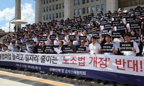 한국경영자총협회와 대한상공회의소, 한국경제인협회, 한국무역협회, 중소기업중앙회, 한국중견기업연합회가 19일 국회 본관 앞에서 지방 경총 및 업종별 단체들과 함께 '노동조합법 개정 반대 경제계 결의대회'를 열었다. 전국 각지에서 모인 경제계 대표 200여 명은 노동조합법 개정안 수정을 촉구하는 경제계 공동 성명을 발표했다.