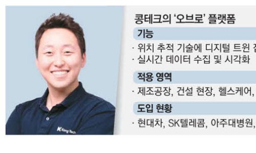 디지털 트윈은 현실 데이터를 실시간으로 수집해 이를 가상 화면에 반영하고 동일하게 구현하는 기술이다. 이렇게 수집된 데이터는 클라우드 기반 플랫폼에 저장·분석돼 다양한 정보를 생성하게 된다. 이 대표는 "이런 정보는 물리적 대상의 상태, 성능, 유지·보수 예측 같은 다양한 측면에서 가치를 창출하며 의사 결정을 지원하는 데 활용된다"면서 "예컨대 제조업에서 디지털 트윈은 생산 과정을 정확하게 모니터링하고 예측 분석을 통해 장비의 유지·보수 일정을 최적화할 수 있다"고 설명했다. 실제 다수 산업 현장이 오브로 플랫폼을 도입해 비용 절감과 생산성 향상을 꾀하고 있다. 중고차·렌터카 플랫폼 기업 오토플러스는 중고차 재생산 공장에서 차량별 위치와 공정 시간 확인을 통한 공정률 개선에 성공했다. 계명대 동산병원은 수술장비 위치 확인을 통해 업무 효율을 끌어 올렸다. 성균관대는 반도체장비 자산 관리와 공용 물품 위치 확인에 콩테크 기술을 활용하고 있다. 현대자동차는 콩테크의 블루투스 무선통신 솔루션을 도입해 차량 관리에 활용하는 방안을 추진하고 있다.